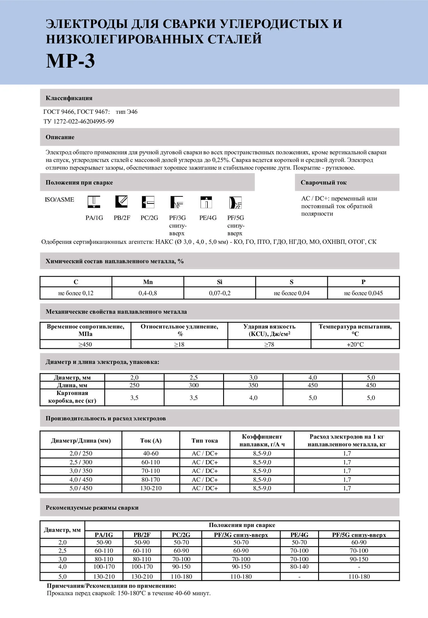 Высококачественный электрод общего применения для ручной дуговой сварки во всех пространственных положениях низкоуглеродистых сталей с нормативным пределом прочности до 450 МПа (включительно). Отличительные сварочно- технологические свойства даже при сварке металлоконструкций с плохой подготовкой кромок и сборкой.