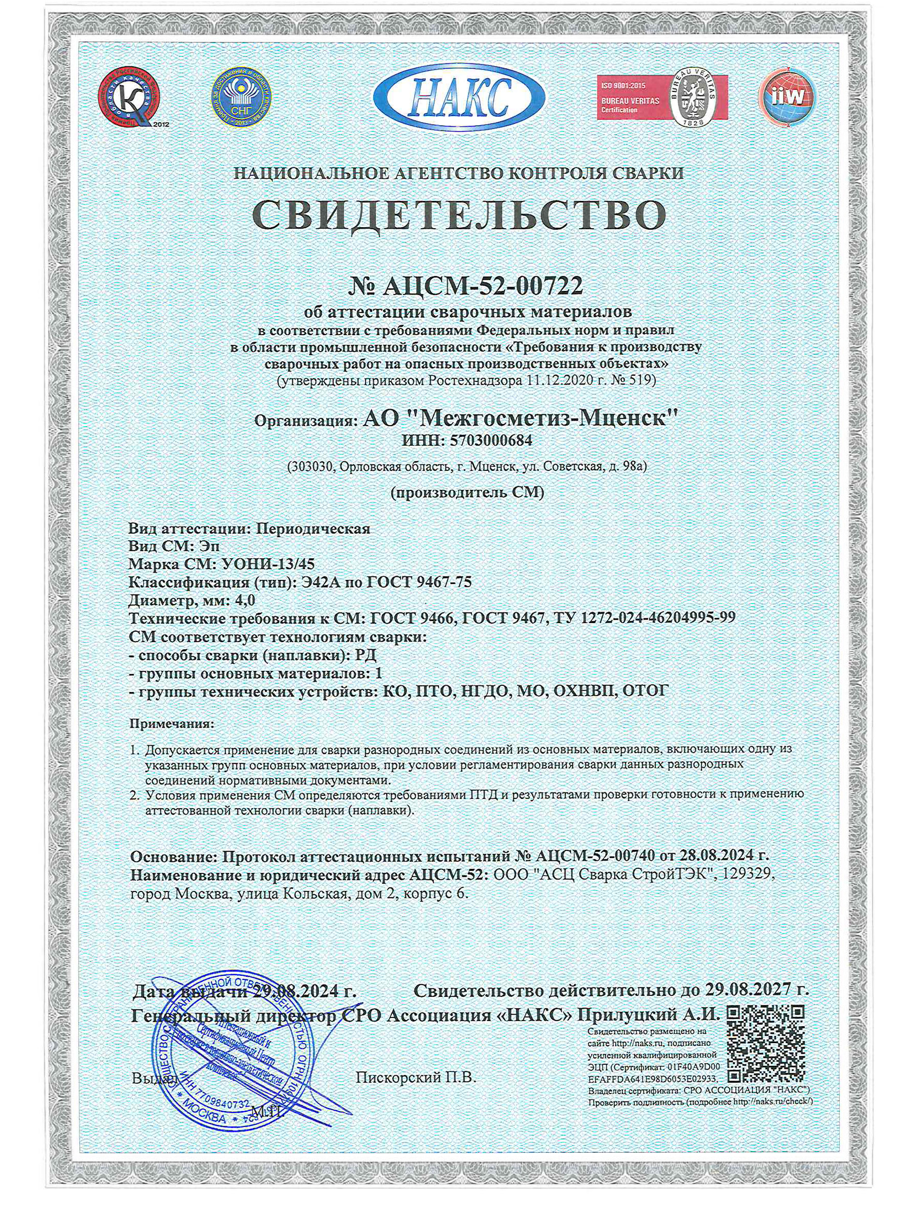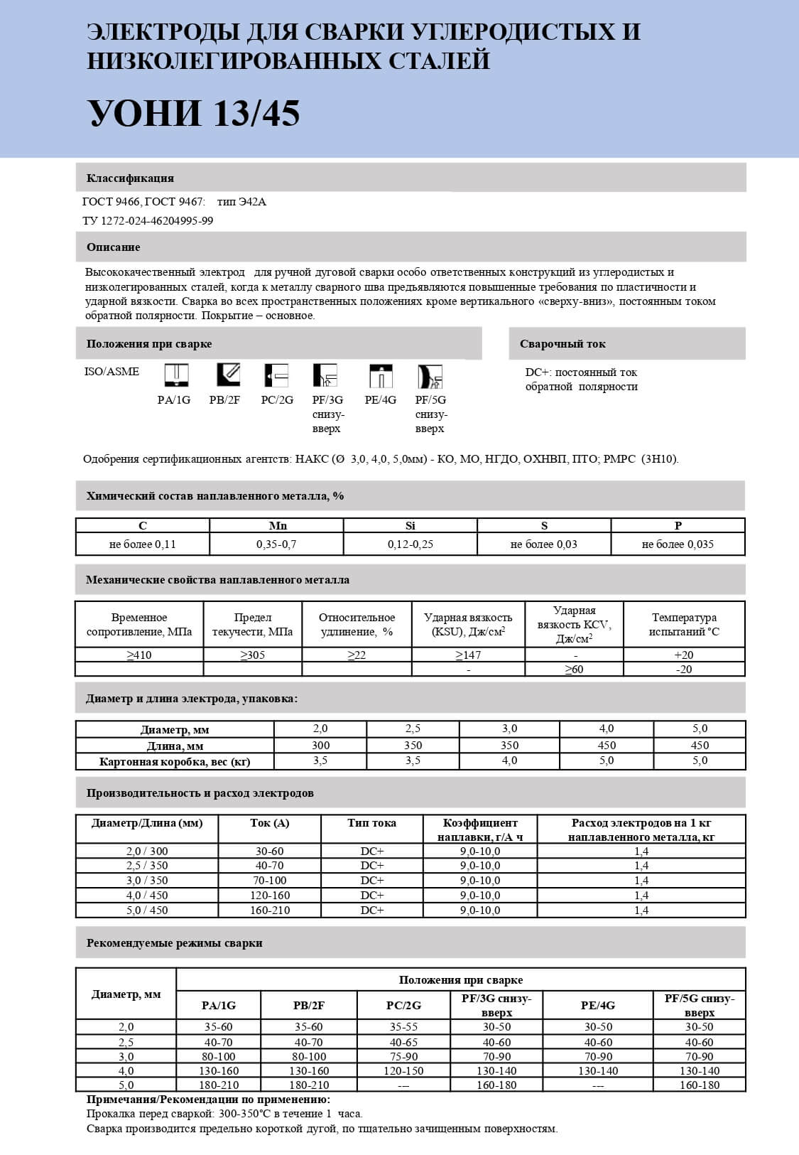 Высококачественный электрод УОНИ 13/45 общего применения для ручной дуговой сварки во всех пространственных положениях низкоуглеродистых сталей с нормативным пределом прочности до 450 МПа (включительно). Отличительные сварочно- технологические свойства даже при сварке металлоконструкций с плохой подготовкой кромок и сборкой.