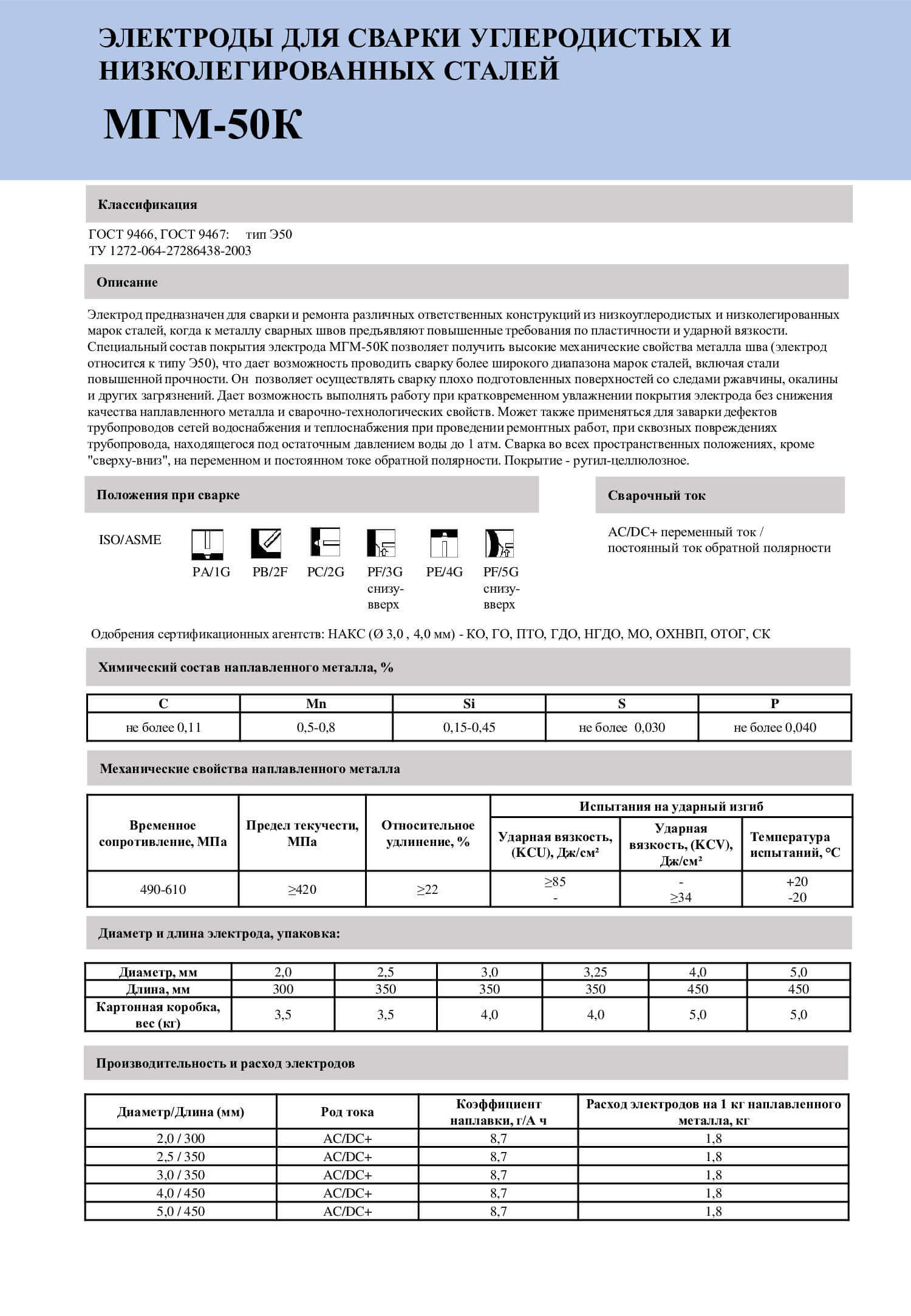 Высококачественный электрод общего применения для ручной дуговой сварки во всех пространственных положениях низкоуглеродистых сталей с нормативным пределом прочности до 450 МПа (включительно). Отличительные сварочно- технологические свойства даже при сварке металлоконструкций с плохой подготовкой кромок и сборкой.